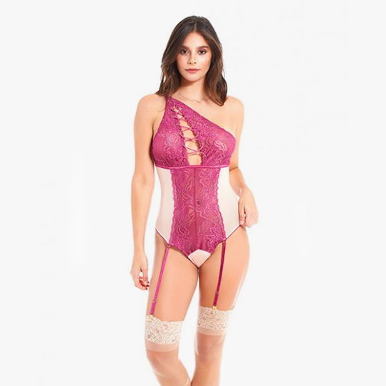 Asymmetrical Lace Teddy with Garters Magenta Sm