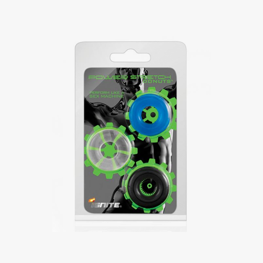 Power Stretch Donuts 3 Pack one black, one clear and one blue cock rings for prolonging male climax. Perform like a sex machine.