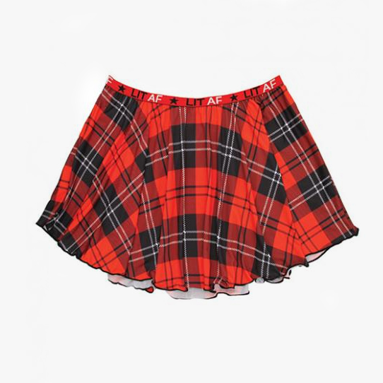 Stretch Plaid Skirt with LIT AF Elastic. Great as outer wear. Breathable Microfiber. Matching skirt for FTAF801 set. Color Red Plaid. Fabric content 95% Polyester, 5% Spandex. Washing instructions hand wash separately in cold water. Do not bleach. Flat dry. Ladies size small to medium, S/M. Sizes 2 to 6. Bust 32 inches to 34 inches. Hips 34 inches to 36 inches.